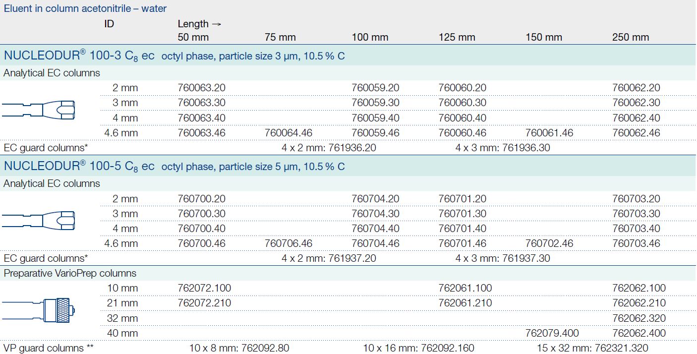 MN-760062.46          EC 250 mm largo / 4.6 mm ID Nucleodur® 100-3,0 µm C8ec        Macherey Nagel       Envase de 1 unidad