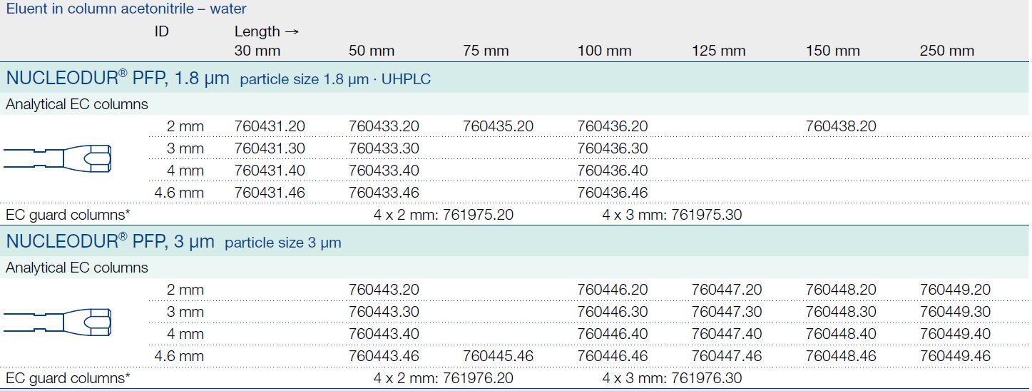 MN-760433.30     EC 50 mm largo / 3.0 mm ID Nucleodur® 100-1,8 µm PFP          Macherey Nagel              Envase de 1 unidad