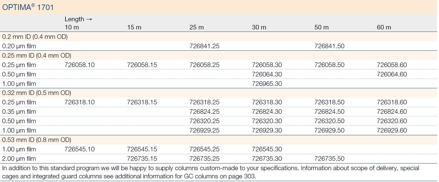 Columnas GC Optima® 1701 ; 0,25 mm diámetro interno y 0,4 mm diámetro externo