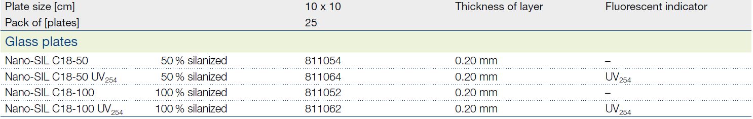 Placas HPTLC Nano-SIL C18 ; Base de Vidrio; Grosor de la capa 0,20 mm; 100% modificada C18; con Indicador UV 254 nm