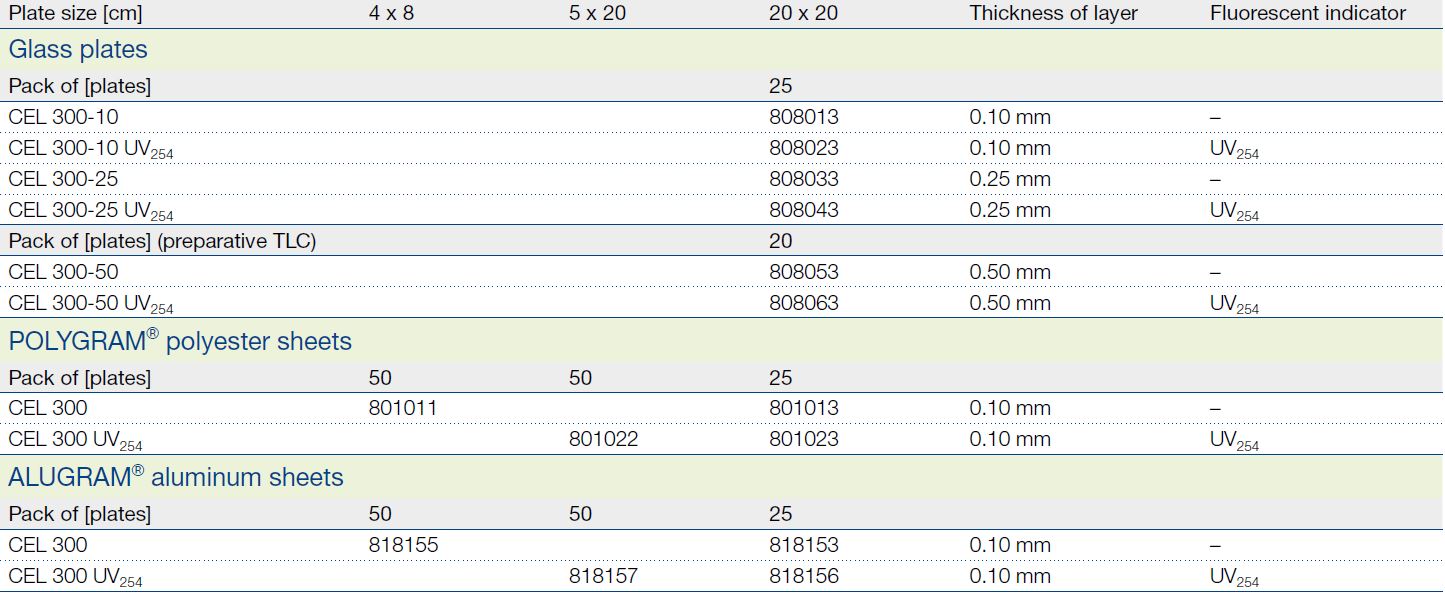 Placas TLC Celulosa MN 300 ; Base de Aluminio Alugram® ; Grosor de la capa 0,10 mm con Indicador UV 254 nm