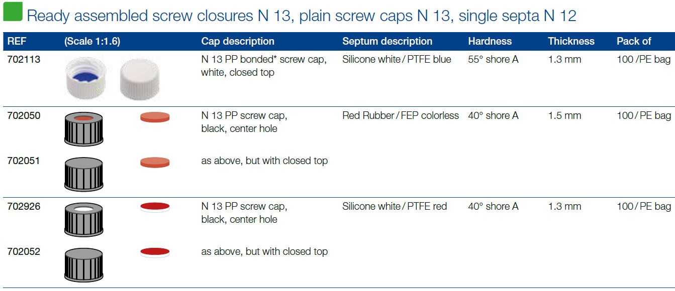 MN-702926 Tapa Rosca N13 negra, incluye septa Silicona blanca/ PTFE rojo Envase de 100 Unidades